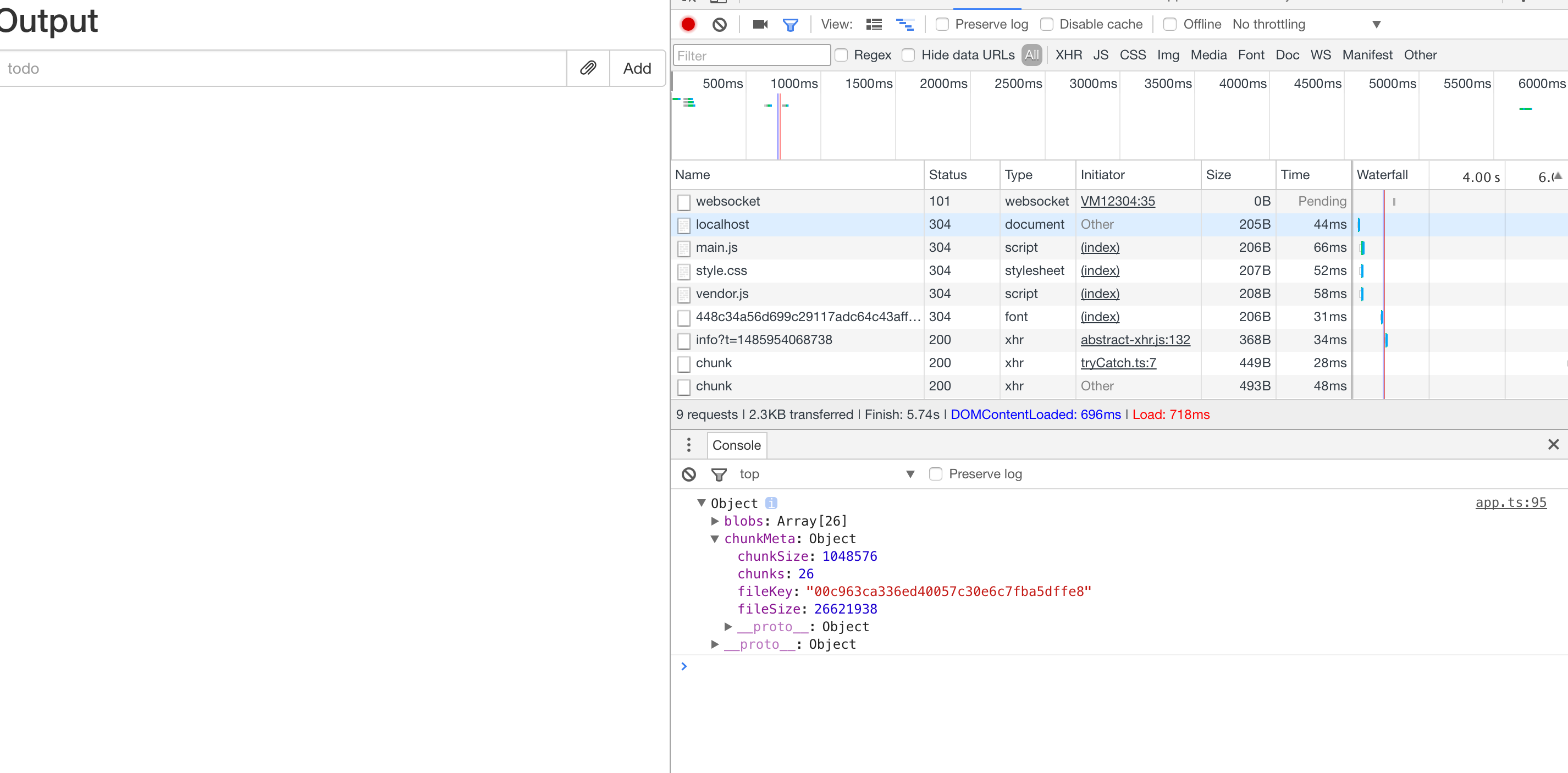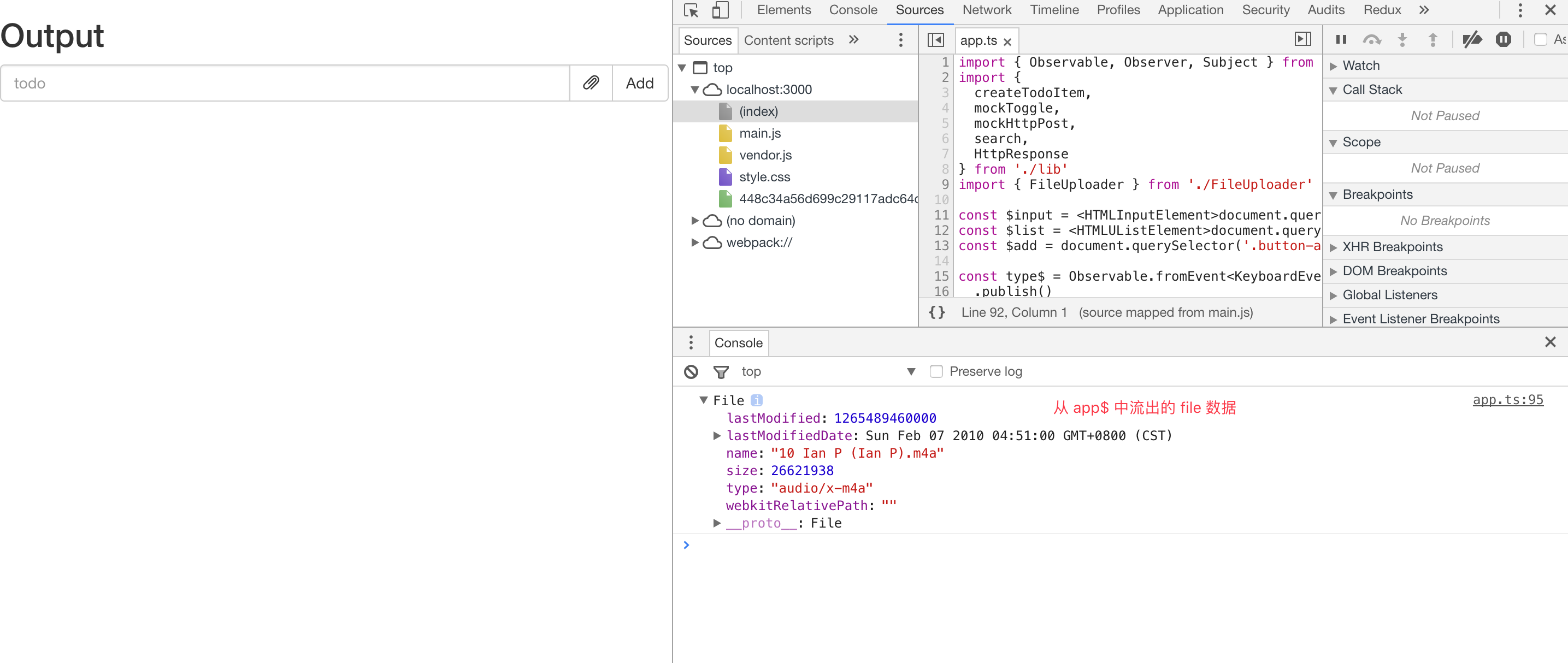 app$.subscribe()At this point, by selecting a file through the attachment button, you can already see the file flowing out of app$ in the console: