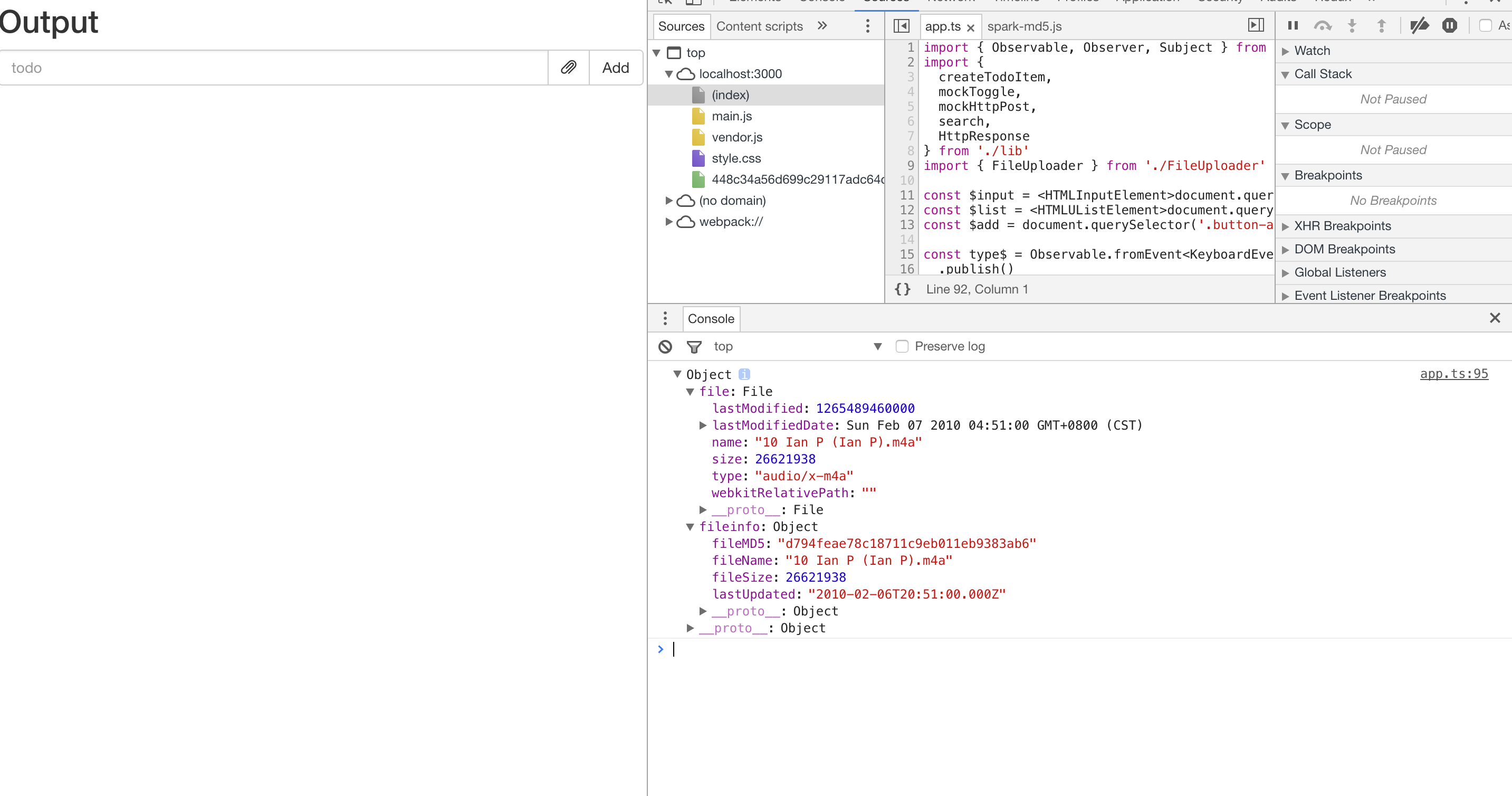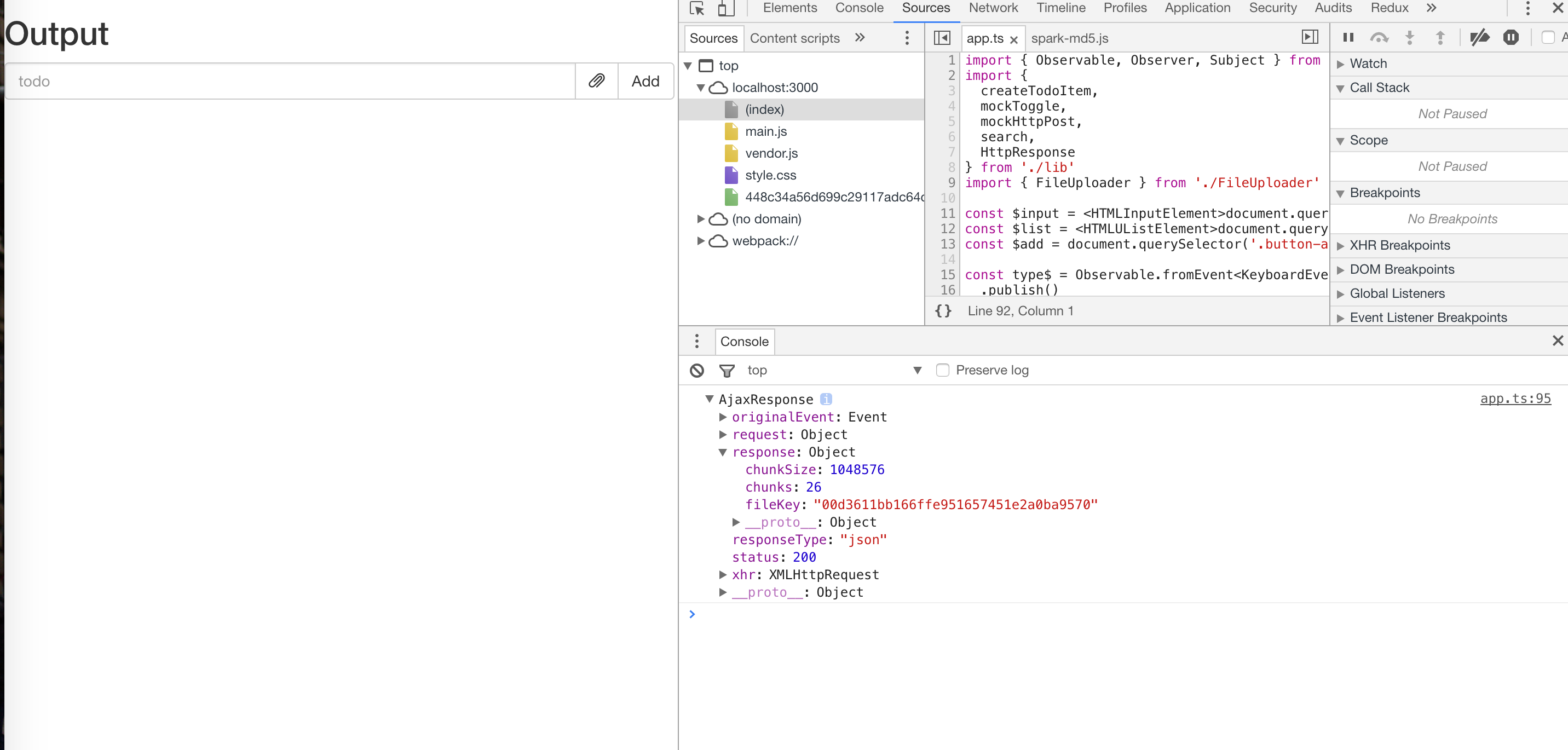 We use FileReader + spark-md5 to calculate the file's MD5 information. Other information can be obtained directly from the File object. Since FileReader reads files asynchronously, we wrap it as an Observable so it can be composed with uploadStream$: