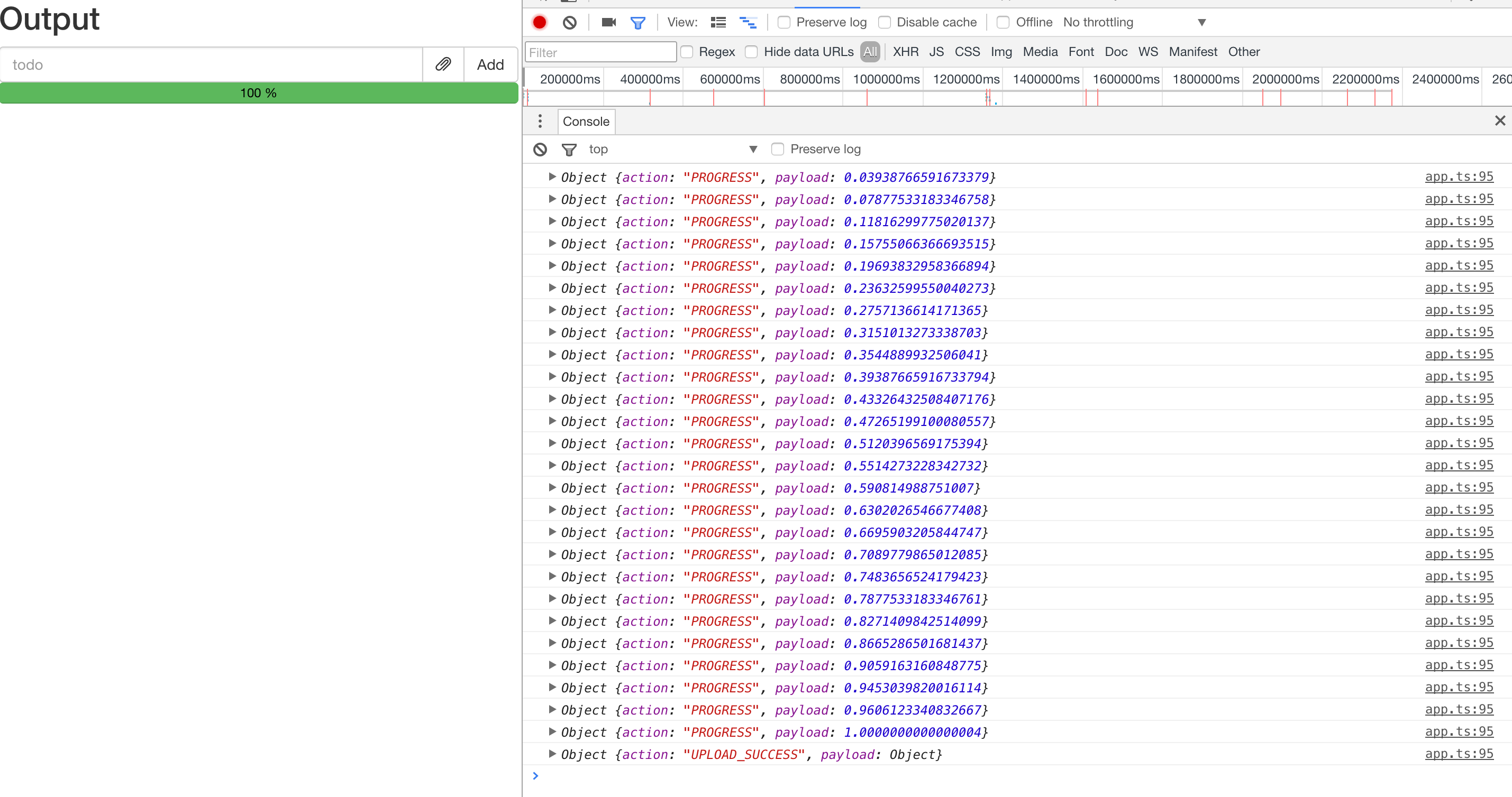 This is a highly abstract article, and due to the constraint of not using a framework, the program relies heavily on the side-effect operator do, which overall doesn't look particularly elegant. Truly elegant FRP should combine RxJS with frameworks like Redux + React, where this file upload component could be written much more elegantly. Of course, the functionality isn't complete -- many edge cases such as error handling at each step haven't been addressed. But that's fine -- this is meant to serve as a demonstration of RxJS's powerful async handling capabilities, and to give beginners the opportunity to hands-on experiment with various RxJS operators while implementing a complex async scenario. In upcoming articles, we will dive deeper into the various operators covered (and not covered) in these three articles, gradually lifting the fog around RxJS.